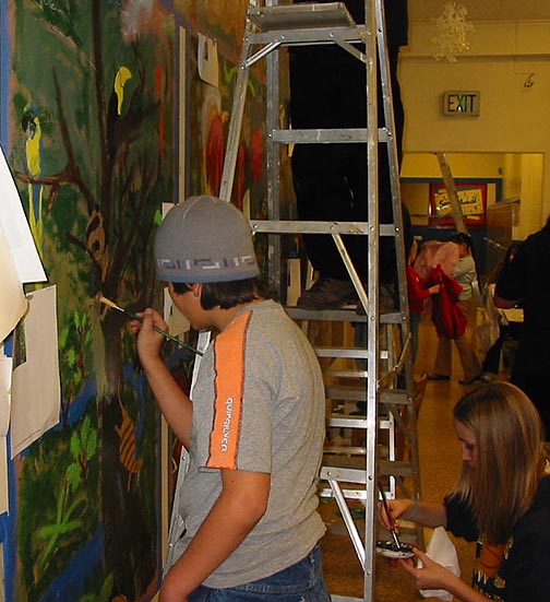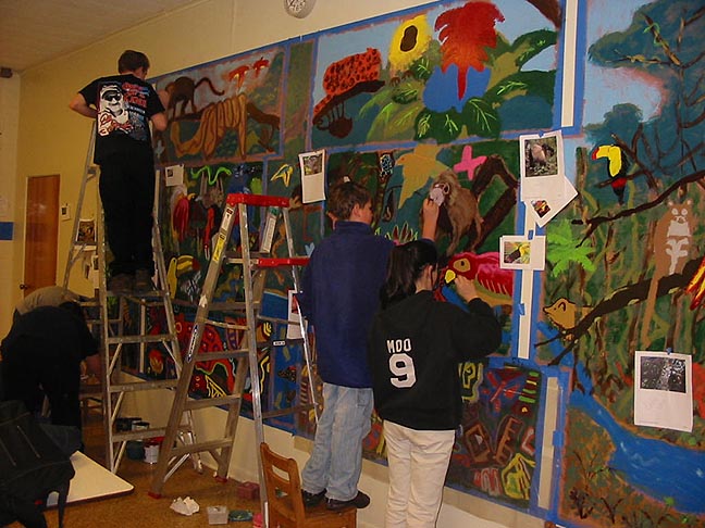 Grades kindergarten through 8th participated in the mural project -- a total of 156 students. The mural theme, "Tropical Rainforest" was selected by the teachers in advance of my arrival. The theme was directly related to current studies for most of the grades. Each grade was responsible for the basic design and content of a particular section of the mural, although other grades could assist in the painting process of sections outside their grade responsibility.