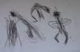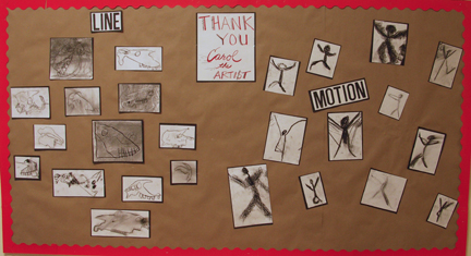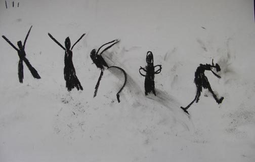 LEFT and BELOW: Kindergarden students' gesture drawings. There is a strong element of abstraction and design present in the works of many kindergardeners. While this is also found in the works of the higher grade levels as well, it is always more intriguing for adults seeing it in the work of children age five or six. It comes across as a level of sophistication beyond the child's age..