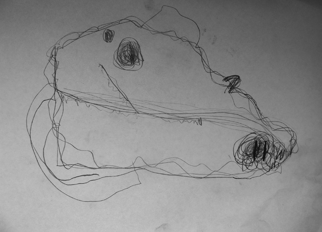 LEFT: This drawing is actually seeing the skull from the angle behind the skull (looking at the area where the spine/neck connects.) If you look closely, you'll see the indications of the vertebrae and the various skull cavities seen from this angle. Not an easy view for anyone, let alone a Kindergardener.